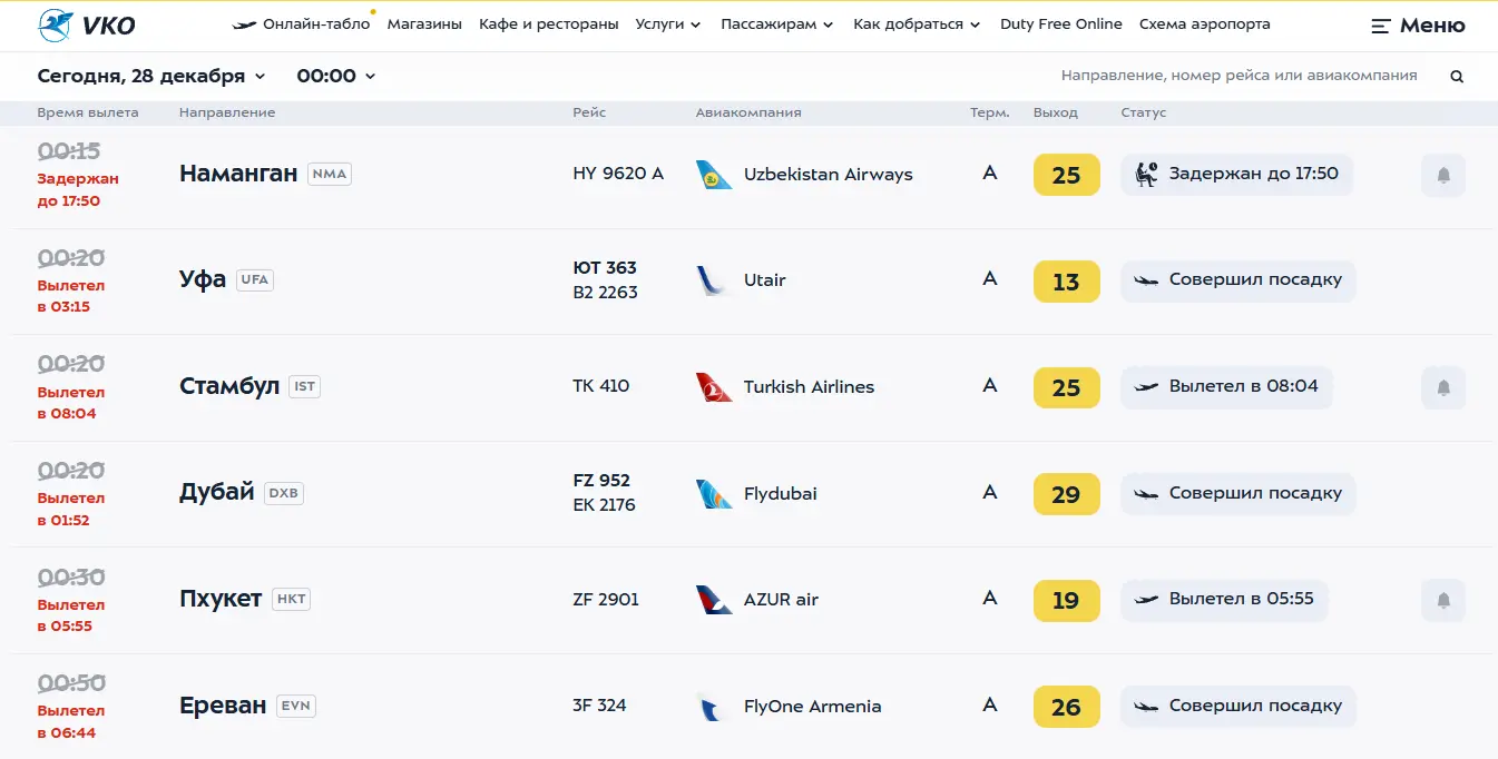 - Волгоград и Дубай: Рейс DP6969 в Волгоград ждал более 12 часов, а SU520 в Дубай отправился с 8-часовым отставанием.