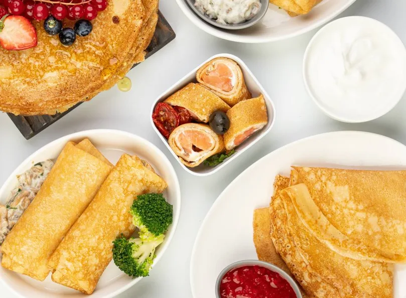 - Традиционные блины: На рейсах длительностью более 3 часов пассажиры смогут насладиться блинами с курицей под сливочно-грибным соусом.
